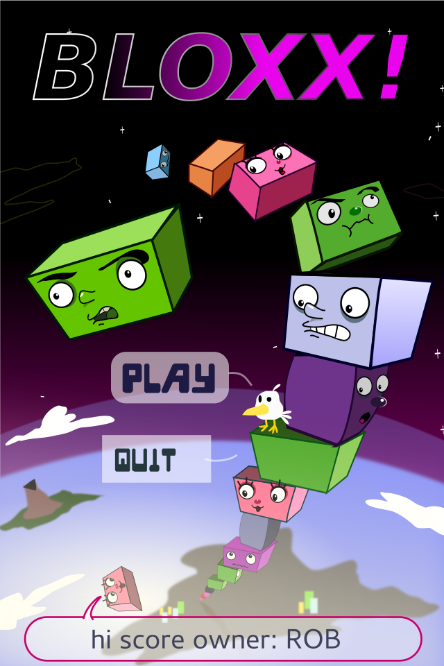 One of the projects was to do a game in a frame concept for Team 17. The deadline was very tight, so it's not very polished. I am not going to go into detail about the game ideas or design, since none of that was my work.There was another ongoing project for a Jenga-like game where you stock blocks ontop of each other. I made a title screen, two backgrounds and animated sprites for the blocks. Each block had a face with a different character. Doing the backgrounds was really fun, since they were vertically very tall. We had a level where you stack blocks all the way into space, another one which started deep underwater and kept going until reaching the surface and so on. I had to use illustrator on that one, since it had better export tools.